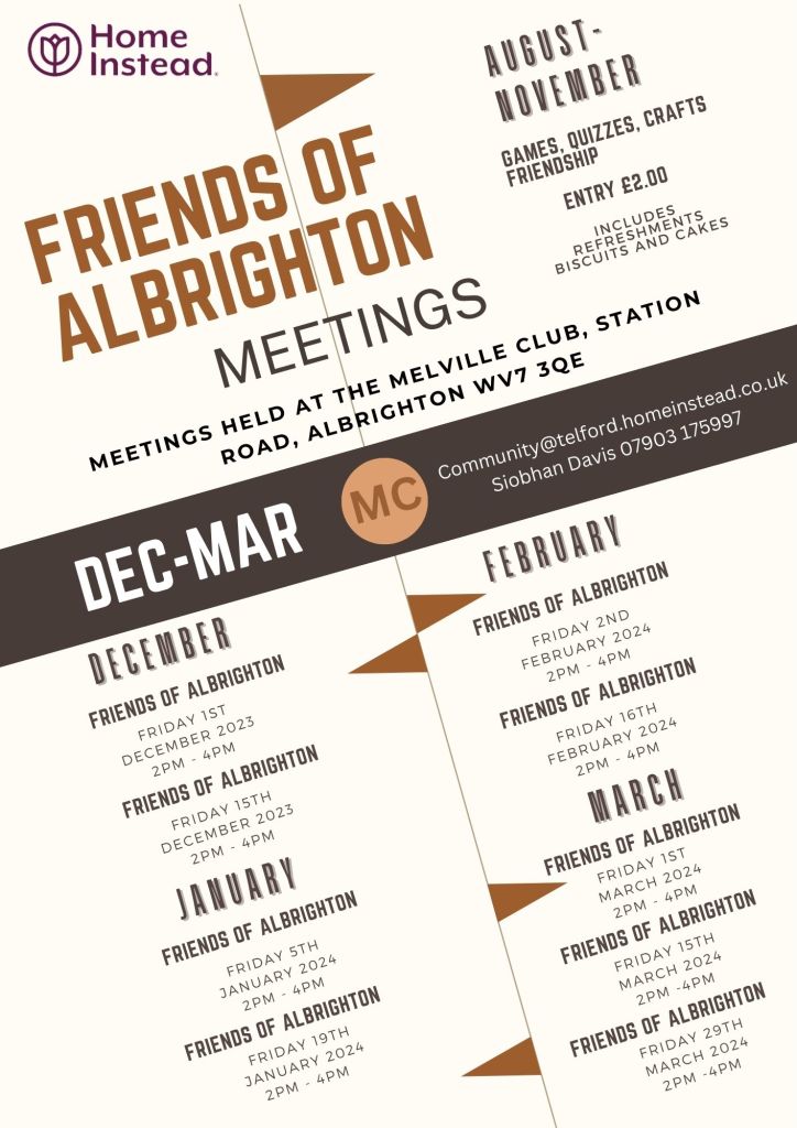 Siobhan Davies is holding ‘Friends of Albrighton’ with future meeting{s} for 2nd & 16th February, 1st, 15th & 29th March from 14:00 to 16:00.