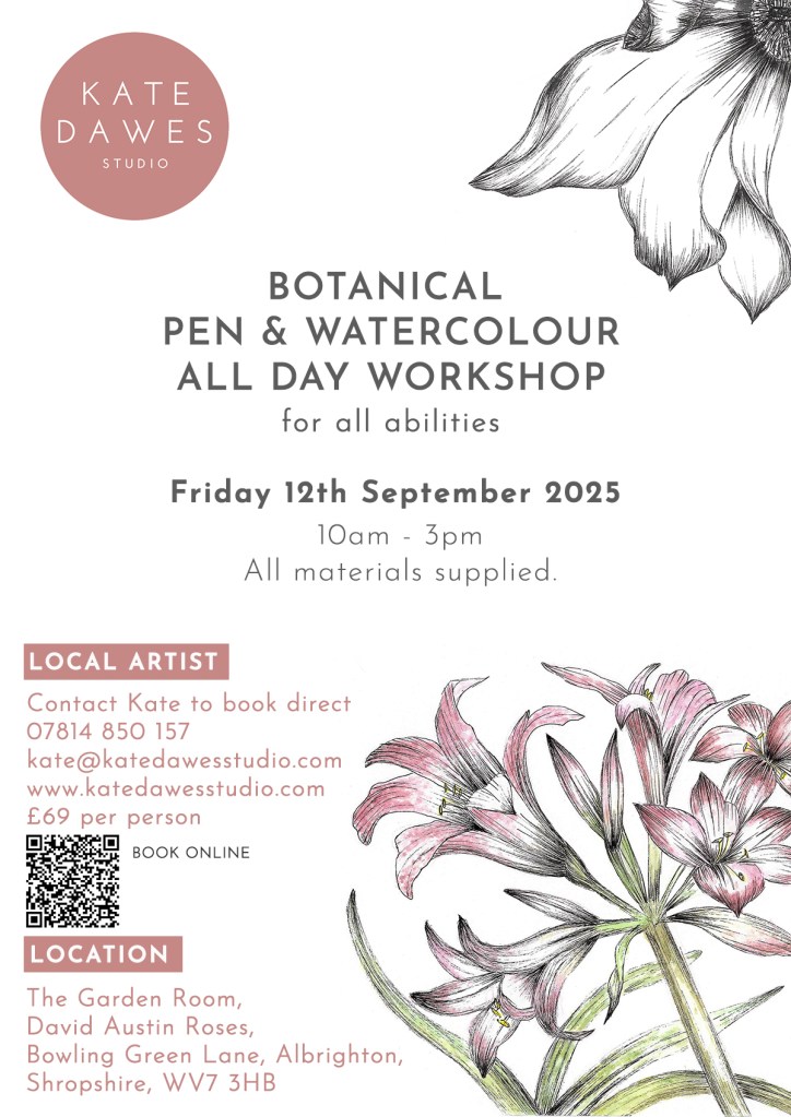 To book your place, please book direct with Kate on her website: https://katedawesstudio.com/products/day-workshop-botanical-pen-watercolour-at-david-austin-roses-friday-12th-september-2025